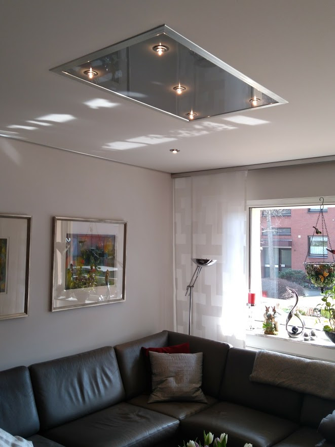 Ein Highlight in Ihrem Wohnzimmer. Die graue Wohnzimmerdecke bzw. das eingelassene Element in Ihrer Plameco Spanndecke kann sich sehen lassen. Mit den gut positionierten Spots wirkt Ihre Decke hell und freundlich.